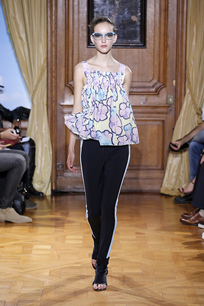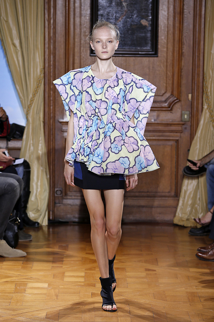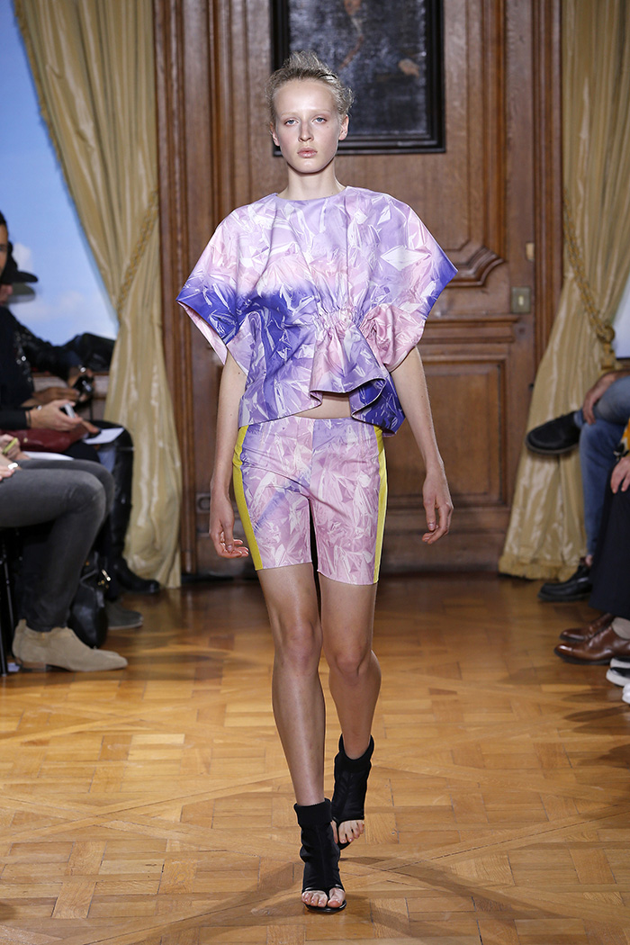 Presented in the Résidence des Pays-Bas, the Dutch designer’s collection hones in on compact tailoring, athletic detailing and an abstract elastication that adds an unexpected twist to the garments. Cycling shorts and pants; tank tops, mini skirts and dresses create a super tight fit, which builds the base of this season’s defile and are complemented by statement pieces such as jackets, jumpsuits and voluminous shirts and dresses which boast a fullness and add to the creation of the SS15 silhouette.